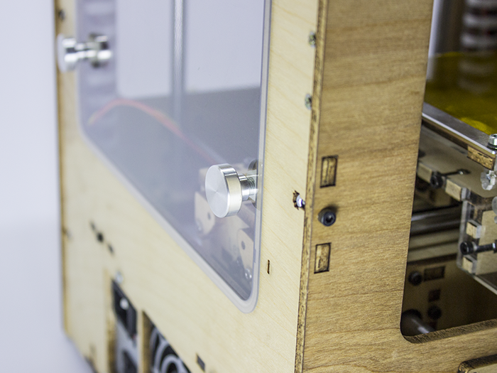The TOM enclosure is very open, there is only material in the corners. This means the generated heat can escape rather quickly. That's why I built windows and inserted them into the frame, so the heat stays inside and the ABS doesn't cool so rapidly. Also note the top window, it's probably the most important because presumably a lot of heat exits there. But there is a reason why the enclosure is that open, it's for easily accessing all kind of different parts of the 3D-Printer. Therefore a requirement was the ability to easily remove the windows. This is done with self-made bolts which can be turned by hand. On the other side of the bolt there is a printed part with a sloped area. When the bolt is turned, it pulls the window into the frame and holds it there.