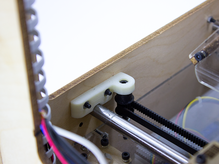 It's important that the tension of the belt is neither too tight nor too loose, otherwise the quality and dimensions of the prints suffer. The bolts which mount the motor can loosen with time, especially with all the vibration. To prevent that and easily adjust the tension, I printed this belt tensioner for my X and Y axis. And to support the other side of the Y-axis I printed this bracket.